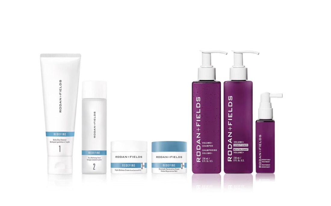 Our best-selling REDEFINE Regimen for anti-aging skincare teams up with the Volume+ Regimen for fuller, thicker-looking hair.