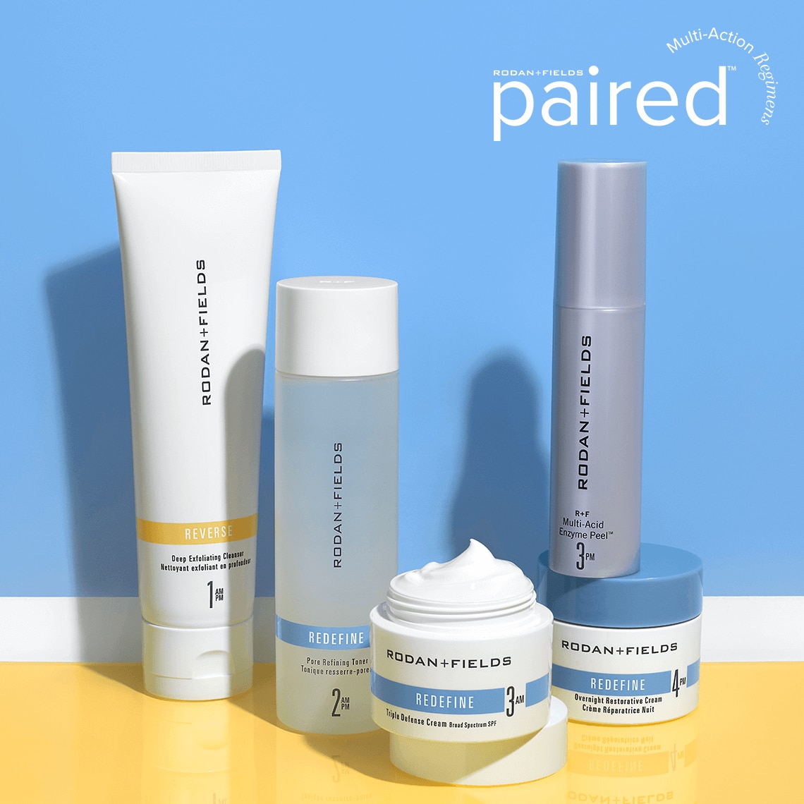 R+F PAIRED Regimens are personalized Regimens that address multiple skin concerns simultaneously. If you are looking to address both primary concerns of lines, wrinkles, and loss of firmness plus secondary concerns of discoloration, uneven complexion, and dullness then R+F PAIRED Regimen for Wrinkles + Uneven Skin Tone is the right Regimen for you. If you are only looking to address key signs of aging including fine lines, deep wrinkles, and loss of firmness, use REDEFINE. If you are only looking to address dullness and discoloration concerns, use REVERSE.